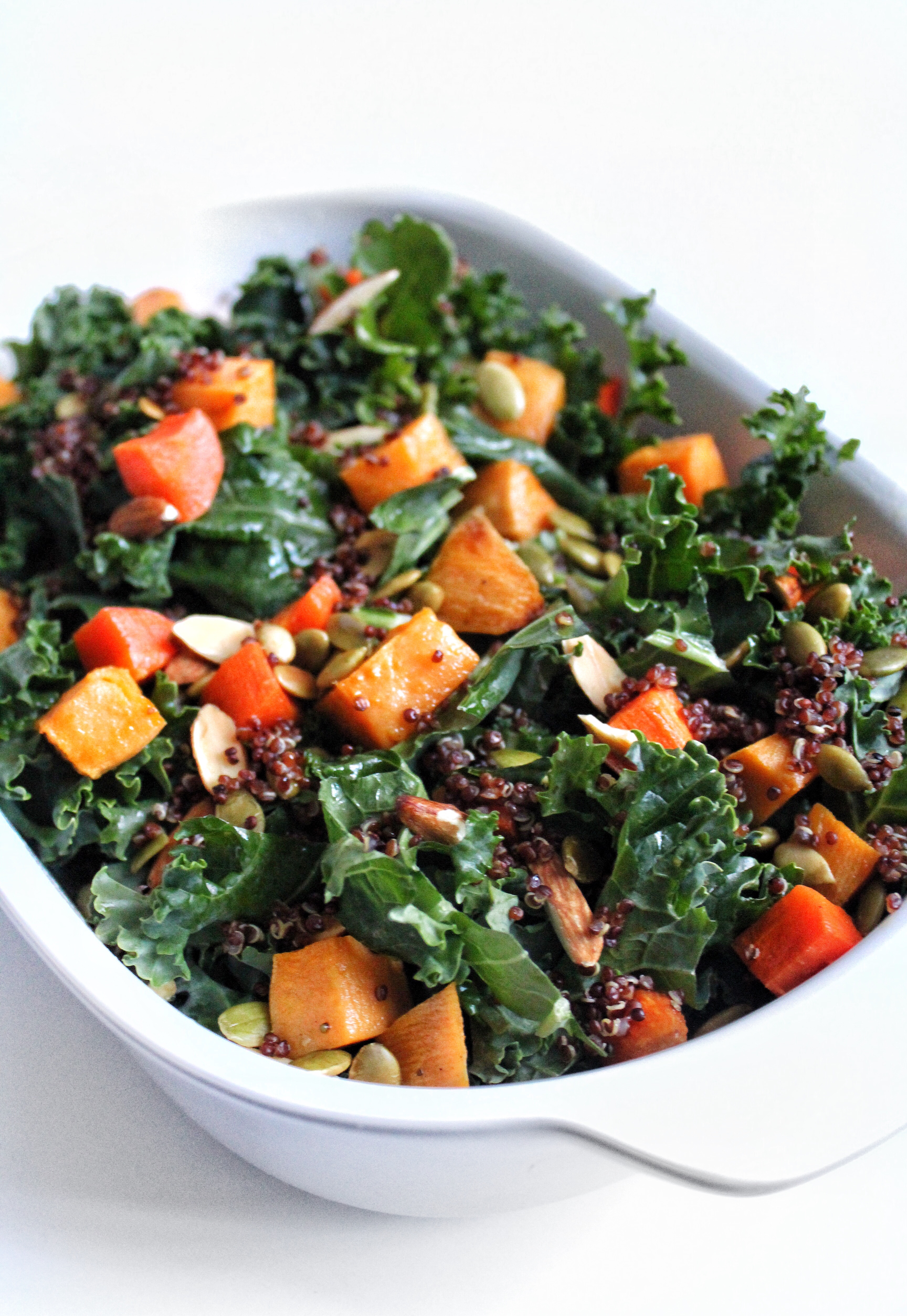 Feel free to get intimate with your kale and massage it with the dressing before adding the remaining ingredients. This will help wilt the leaves slightly.